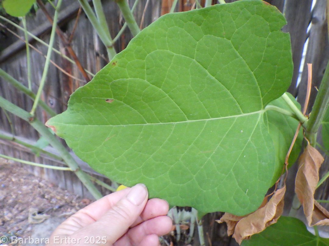 Japanese knotweed leaves are always less than 20 cm long, relatively flat-based, and nearly glabrous except for tiny bumps along the veins.  Giant knotweed, in contrast, has much larger (often > 20 cm) leaves with a more deeply cordate base and multicellular hairs along the veins.  Bohemian knotweed is somewhere in between, with sharp unicellular hairs scattered along the veins on the undersides of the leaves.